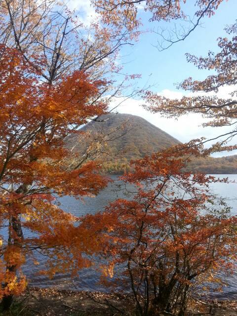群馬県の榛名湖畔から、榛名富士と紅葉。