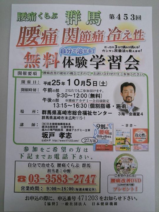 腰痛治療の常識を変え、27万部のベストセラーになった本の坂戸孝志先生のセミナーが高崎で開催されます。