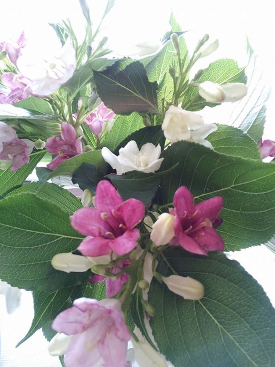 花の色が、白、薄ピンク、濃ピンクと次々変わるボケの花。