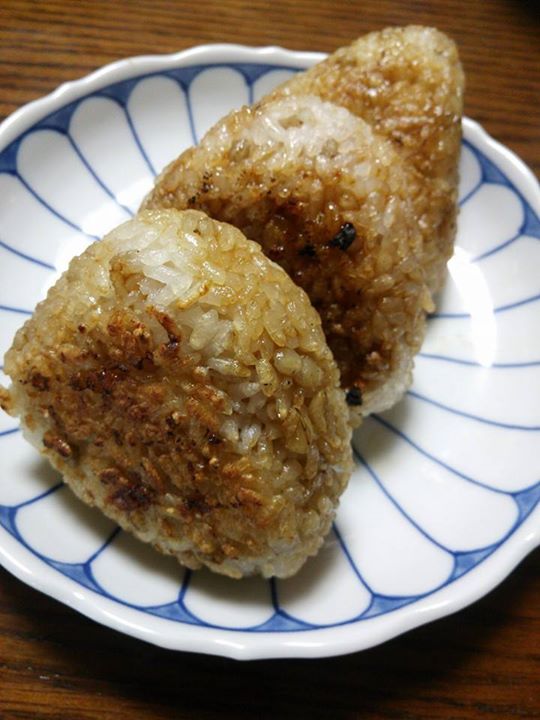 小さめの三角おむすび、手作りの梅干しを入れて、醤油とみりんをつけて焼きます。