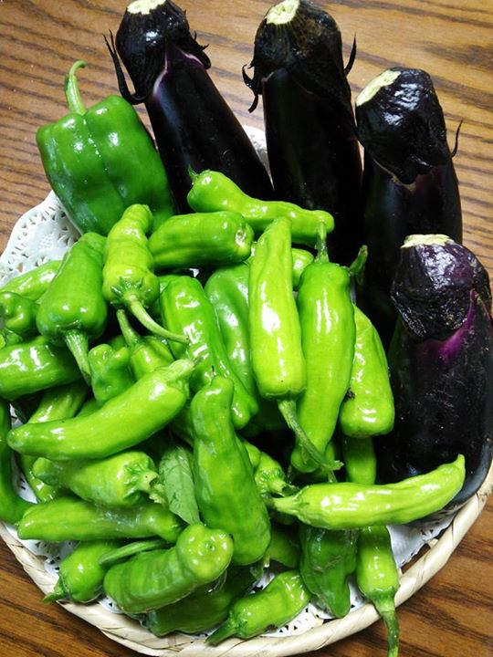 これぞ朝採り、艶々のししとう、茄子、ピーマンが神々しい。