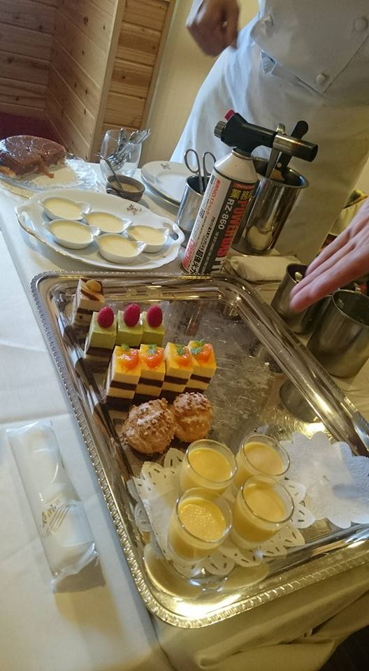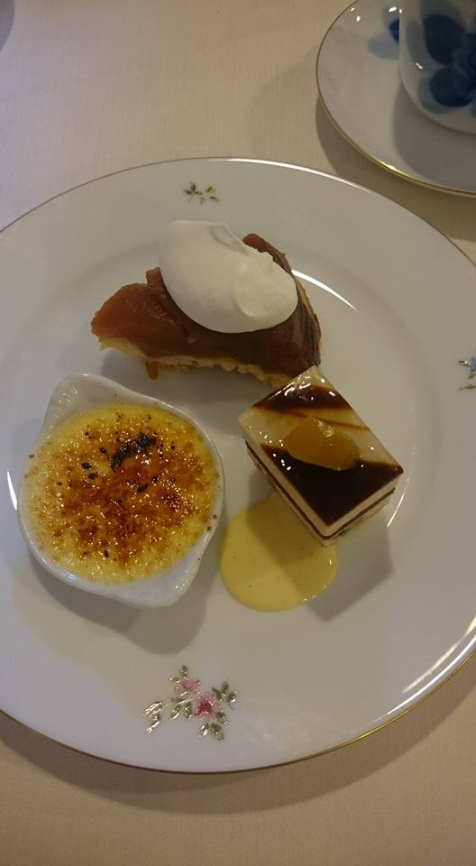 前菜はズワイガニのテリーヌ、スープは牛蒡のポタージュ、メインはすずきの白ワインソース、サラダ、3種類のデザートが選べて、たっぷりの美味しいコーヒーとともに。
